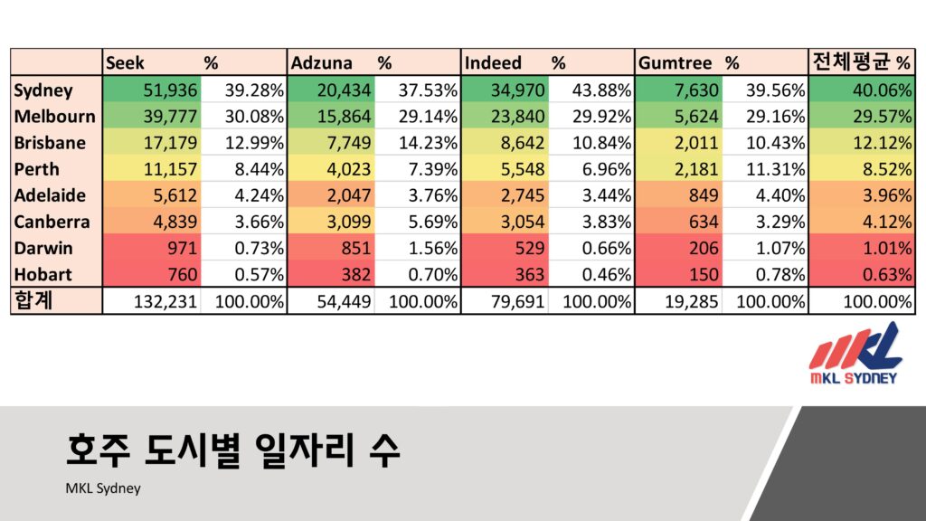 호주에 대표 일자리 사이트에서 각 도시별 일자리를 조사해봤습니다.