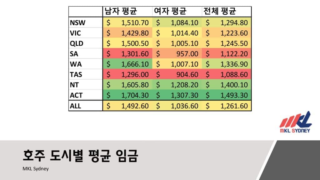 상대적으로 WA (퍼스)의 경우 여성분들의 평균 임금이 남성분들에 비해 많이 낮습니다.