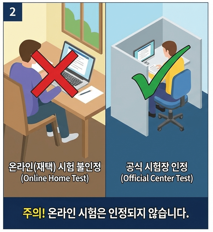 시험은 반드시 공인 시험장에서 오프라인으로 응시해야 합니다.