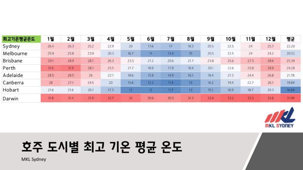 캔버라와 호바트는 연평균 기온이 가장 낮은 도시들 입니다.