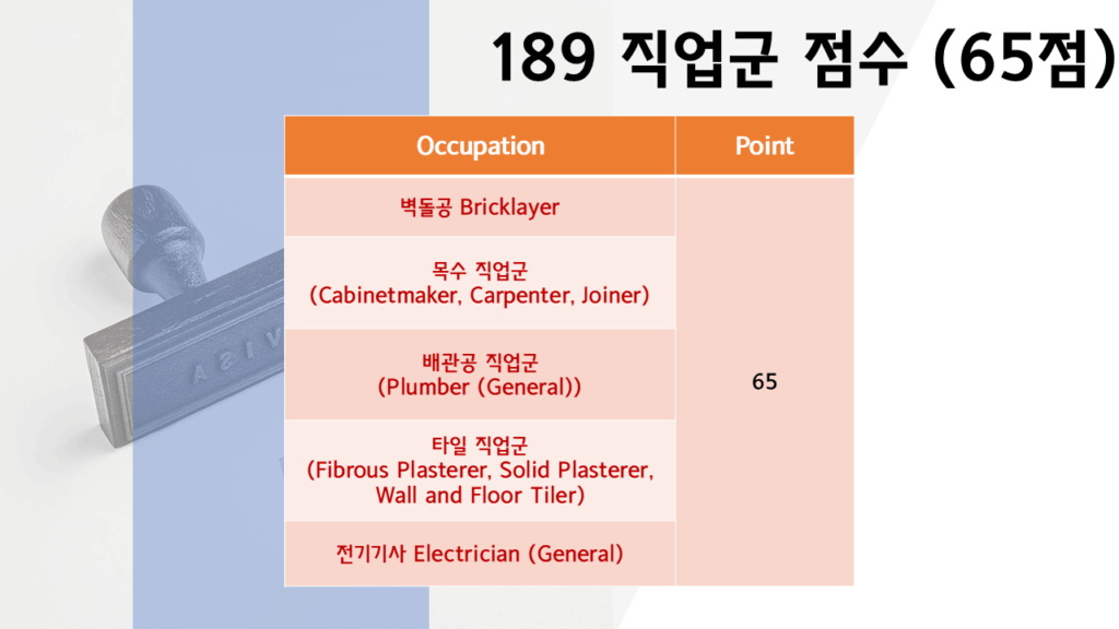 - 벽돌공 (Bricklayer), 목수 (Carpenter, Cabinetmaker), 배관공 (Plumber), 전기기사 (Electrician), 타일공 (Tiler): 65점에서 초청